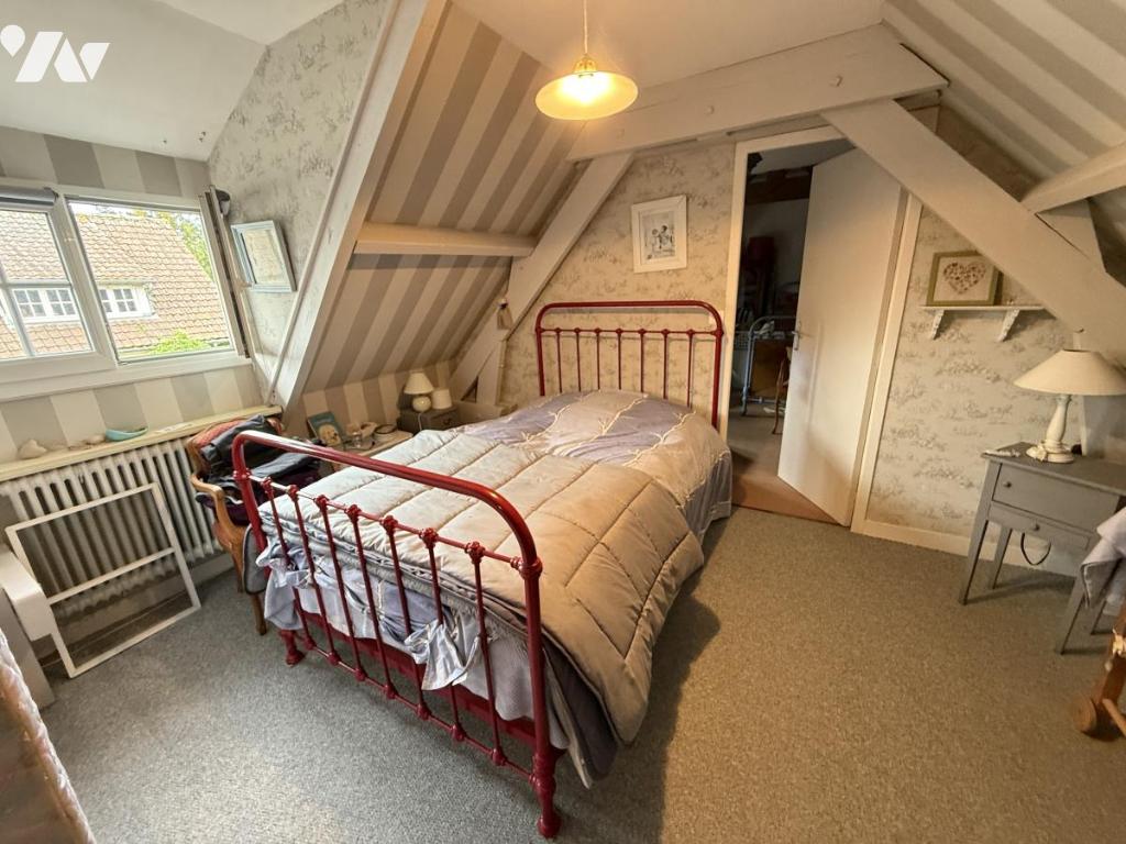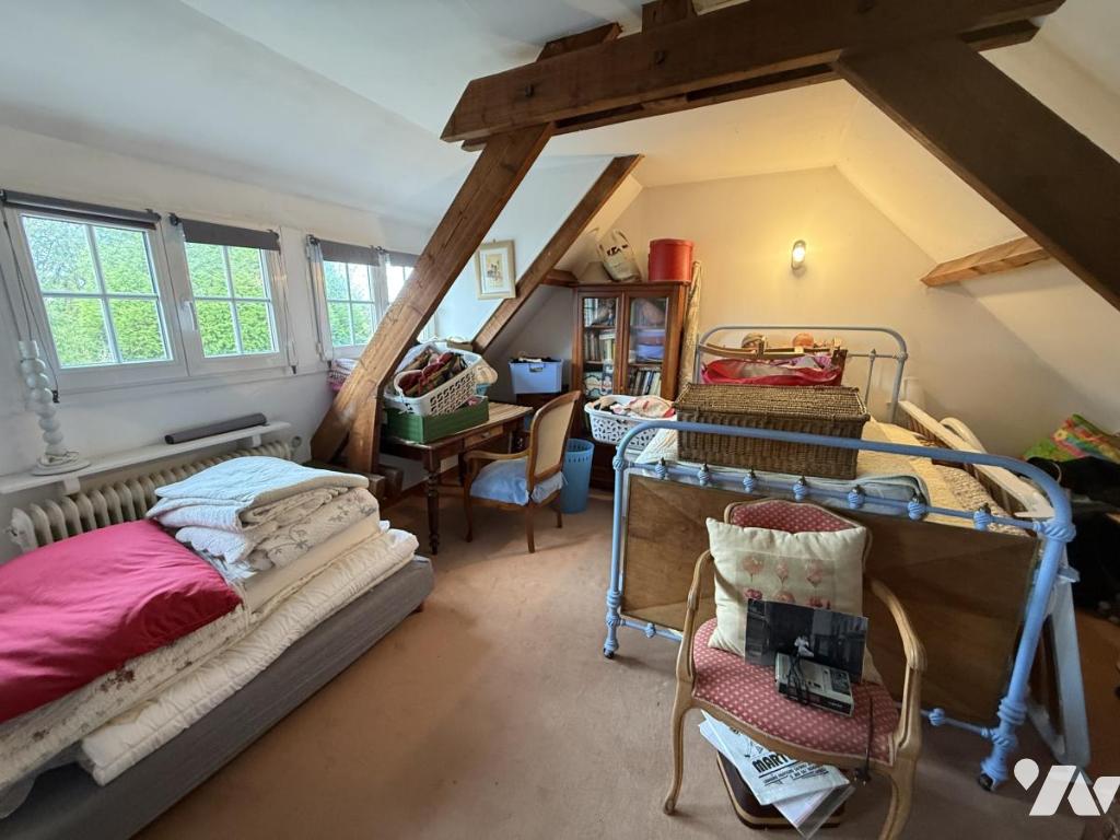A l'étage un palier desservant deux chambres dont une passante, une salle de bains avec baignoire et vasque, WC de type sanibroyeur.